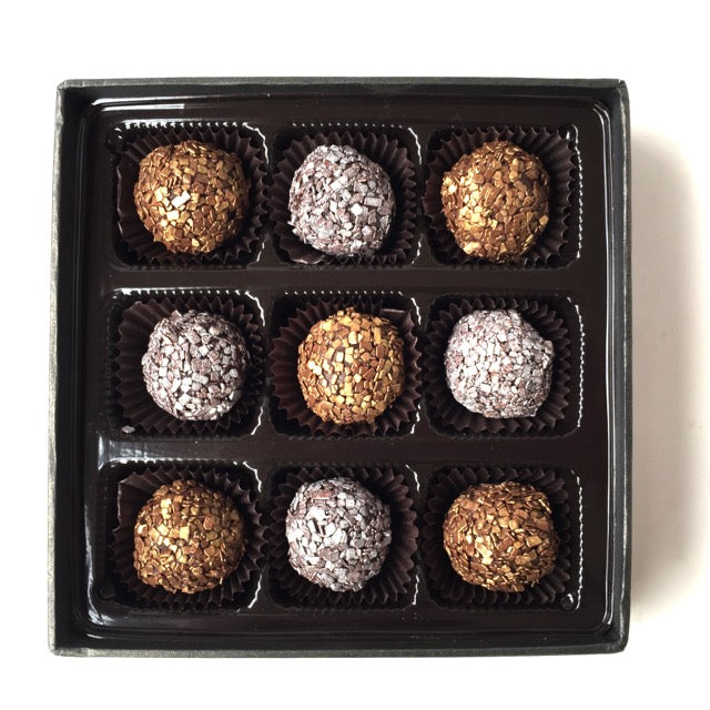 Silky, dark chocolate champagne ganache truffles hand-rolled in dark chocolate gold or silver 'sequins'.