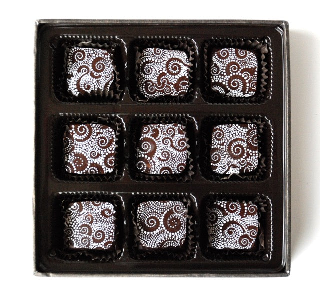 An assortment of our deliciously decadent, hand-painted dark chocolate and milk chocolate bonbons. Flavors include: Pistachio & Rum, Coffee & Hazelnut, Blackened Sugar, Salted Peanut, Mango & Passion Fruit, Gooey Milk Chocolate Caramel, Caramelized White chocolate & Bourbon, Fruit & Nut, Brown Butter.
